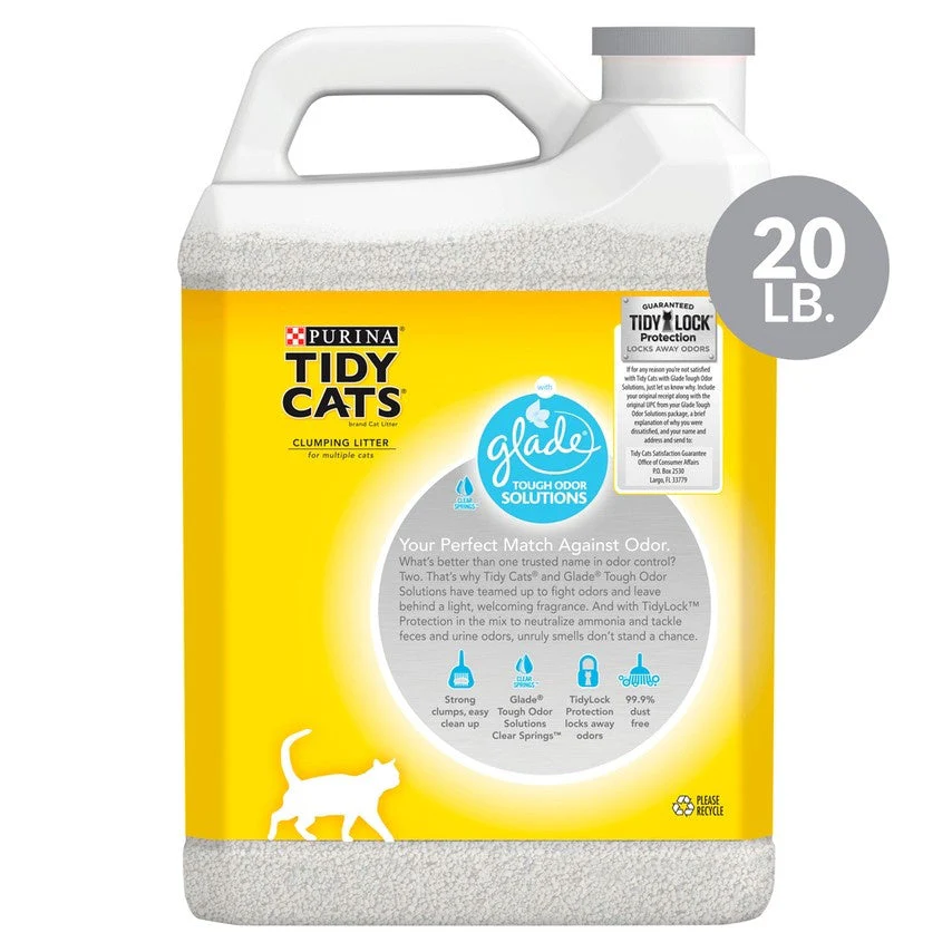 Tend to your cats' personal needs while keeping your home smelling fresh with Purina Tidy Cats with Glade Tough Odor Solutions Clear Springs clumping litter. The 99.9% dust-free formula pours clean into each litter box, keeping messes to a minimum, and the odor-neutralizing action defends against overpowering smells. With a light, pleasant Clear Springs fragrance, this clumping cat litter adds a delightful scent to your home and makes each cat's box a welcoming place. Packaged in a convenient single-handle jug, this litter is easy to pour, store and carry. Stock up on this Tidy Cats odor control litter, so you have an ample supply for whenever your cats' litter boxes need to be freshened up. Formulated for multiple cats, this clumping kitty litter takes the hassle out of cat box maintenance. We recommend scooping solid waste every day and cleaning each litter box with warm water and a mild detergent in between litter changes to keep each box tidy and ready to use. When switching to this odor-fighting litter, gradually introduce it to each cat's box so they can become used to the pleasant scent and new texture. Pour 3 to 4 inches of litter in each box so your cats can dig around to their individual comfort level, and add new litter to the boxes as needed. For more ways to fight odor and keep your cats' corner neat and clean, explore our other litter box solutions. Tidy Cats litter box liners contain litter for easy box changes, and Tidy Cats litter deodorizer brings a crisp, clean scent to your home to fight tough odors. With so many different options to choose from, there's sure to be a Tidy to meet your cats' needs. Use Purina Tidy Cats with Glade Tough Odor Solutions Clear Springs clumping cat litter in your home, and let your feline friends know you care about keeping them happy and content.